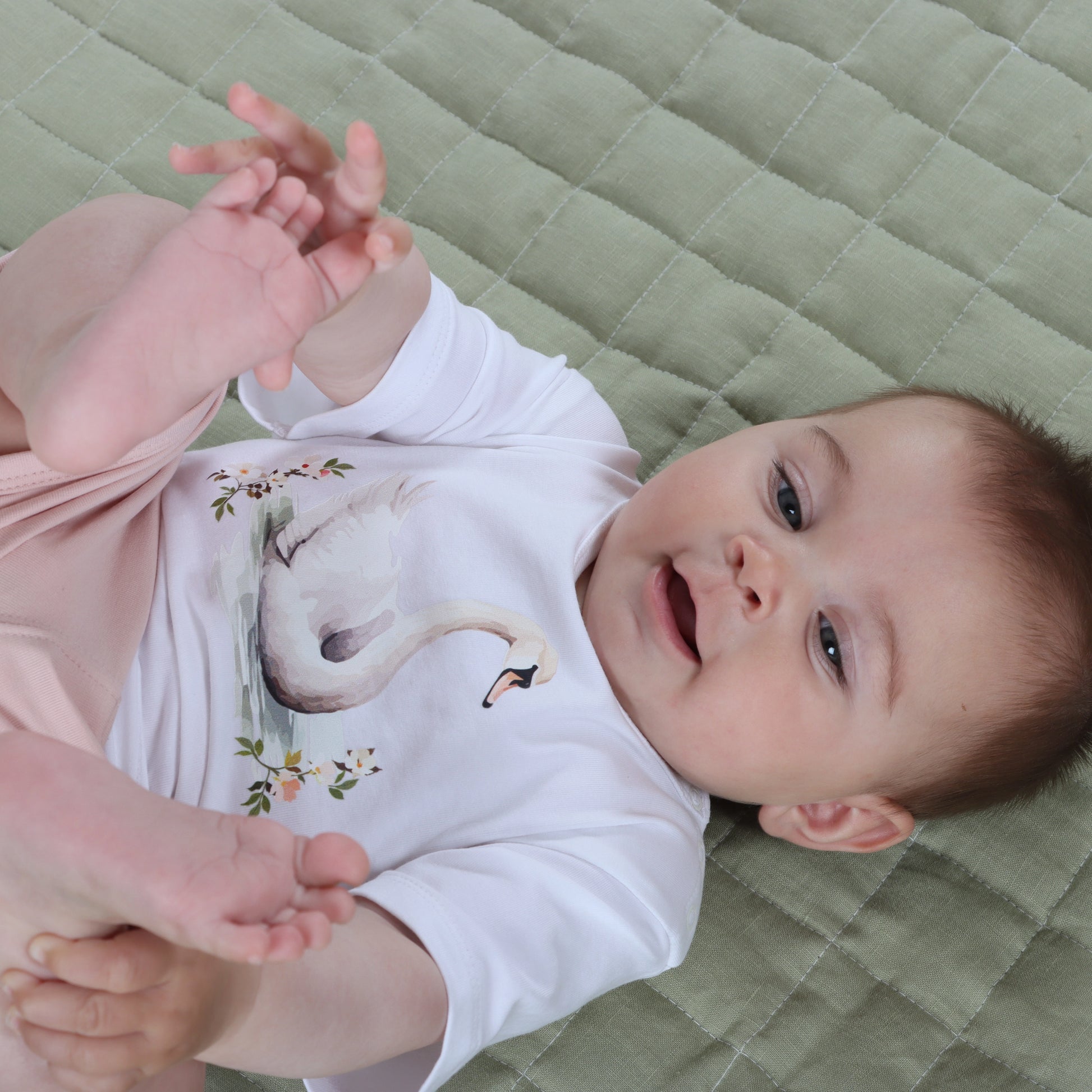 Little Bee by Dimples Petal and Plume Collection is made using Oeko-Tex Certified Organic Cotton. With its gentle hues and versatile style, this gorgeous swan print adds a dash of elegance to any outfit, ensuring your baby looks adorable wherever they go.
