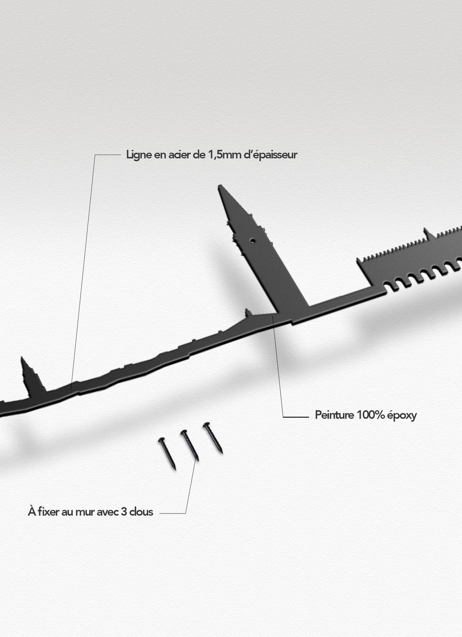 TheLine are laser cut from 1.5mm thick steel and then painted with black epoxy. They are secured on the wall with three nails (for the 50cm), which are included in the boxes. The Line is made in France.