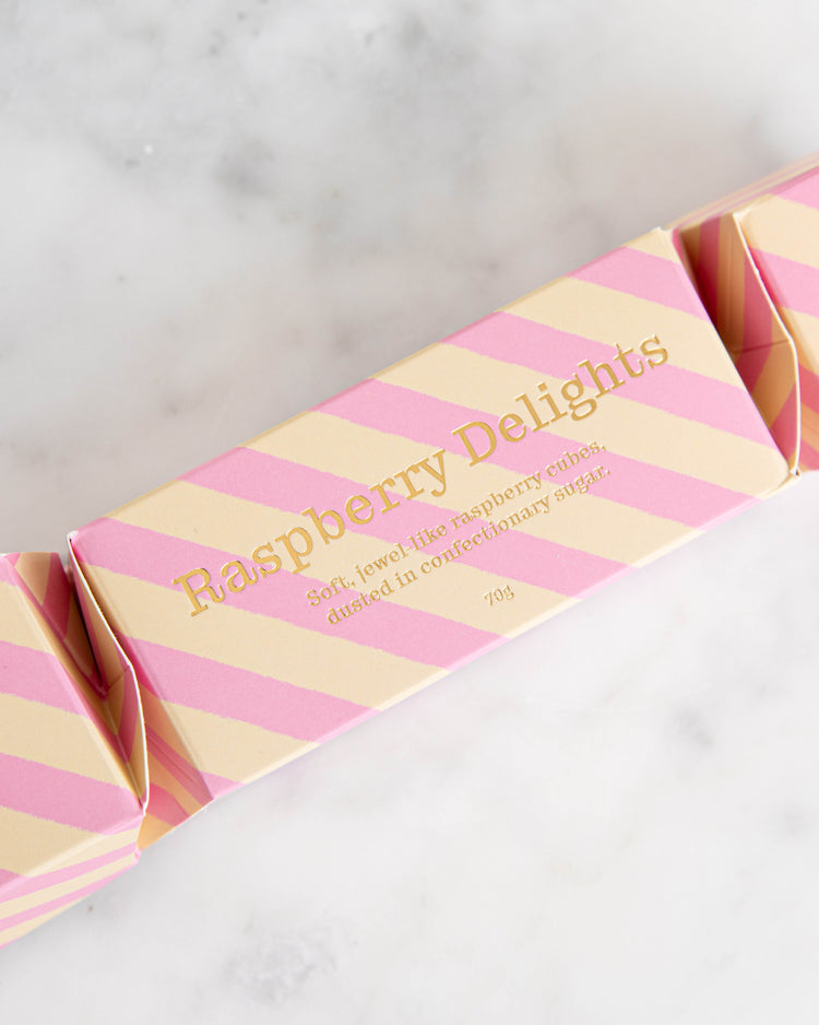 Crack into our sweetest NEW Christmas cracker this season. Find inside velvety marshmallow infused with freeze dried raspberry dusted in confectionary sugar. Tart, sweet delights made with fresh raspberry puree.