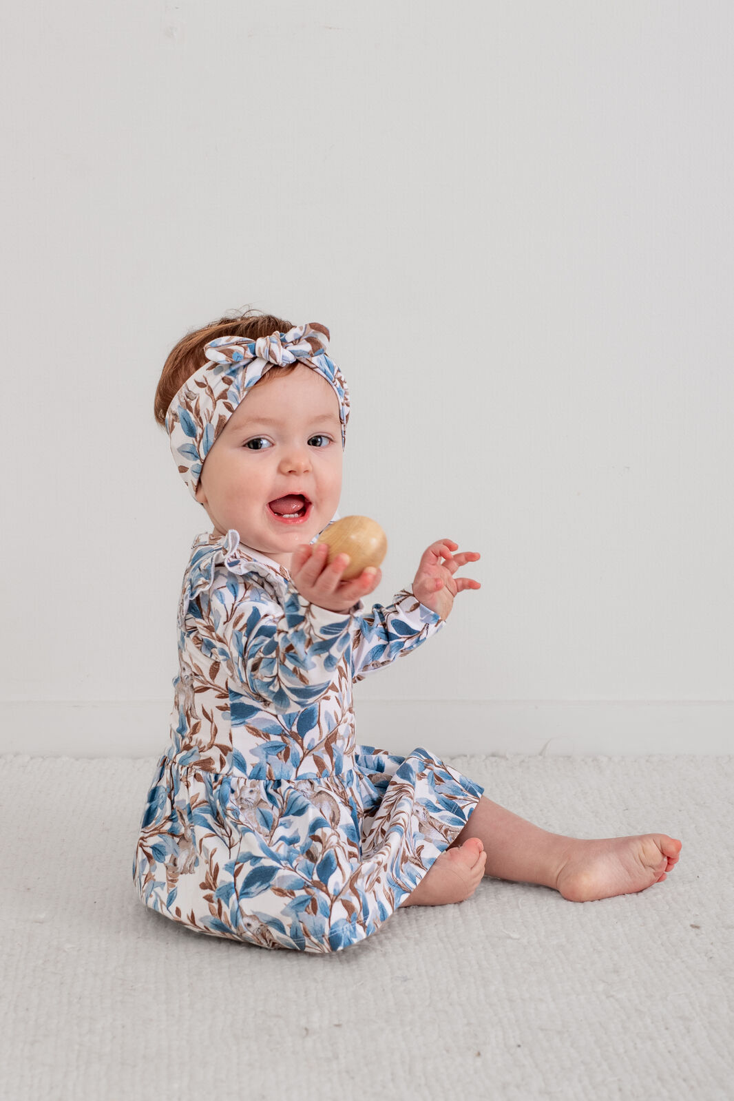 Complete the look with our Eden Baby Headband, featuring the delicate vine and bunny print in rich blues and browns on a crisp white base.