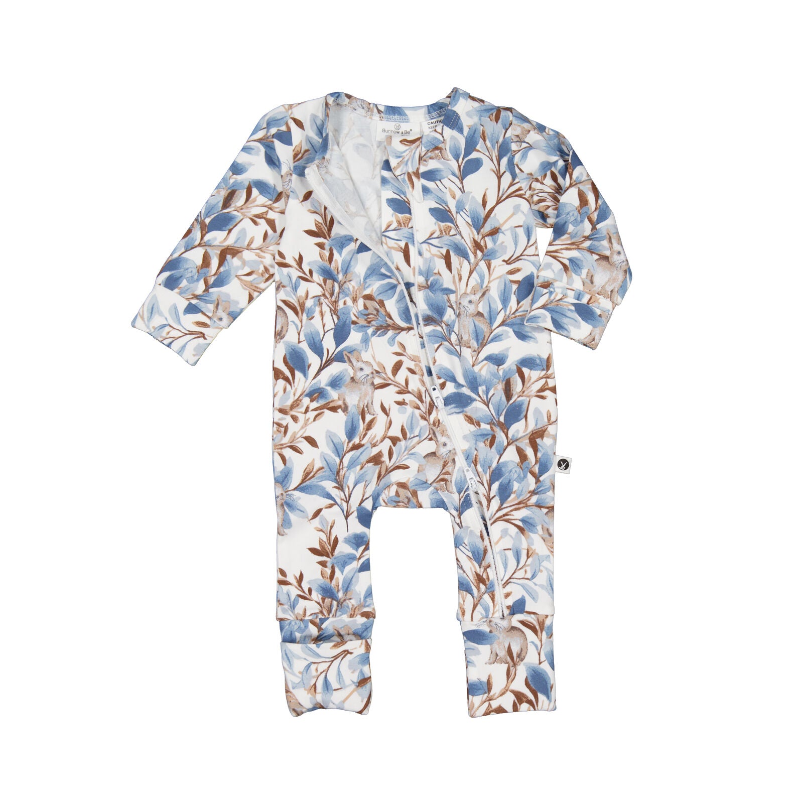 Bring whimsy and comfort together with our Eden Long Sleeve Zip Suit. The all-over vine-like foliage in rich blues and browns, paired with a cute hidden bunny on a crisp white base, creates a playful yet timeless print.