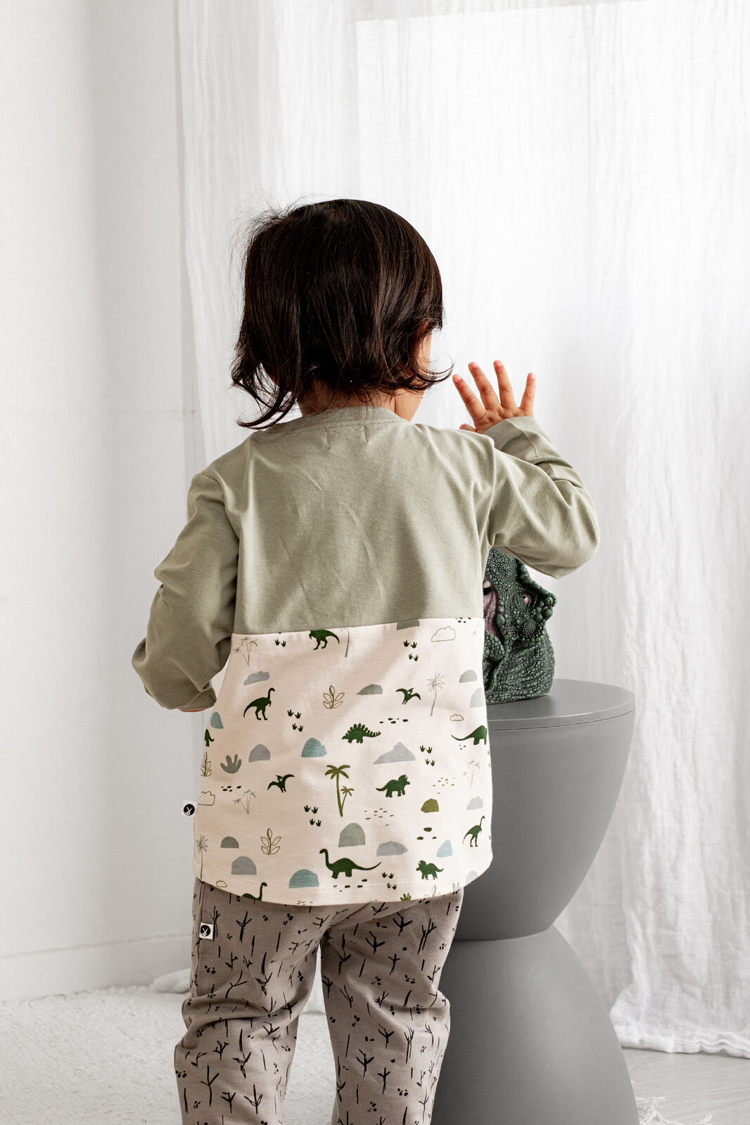 The Jurassic Roam Block Long Sleeve T-Shirt is the ultimate mix-and-match piece, with our seagrass colour on the sleeves and chest and dinosaur print around the body. Made from our signature organic cotton elastane fabric, this top offers softness and stretch for active little ones. It's perfect for layering or wearing on its own for everyday adventures.