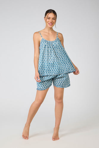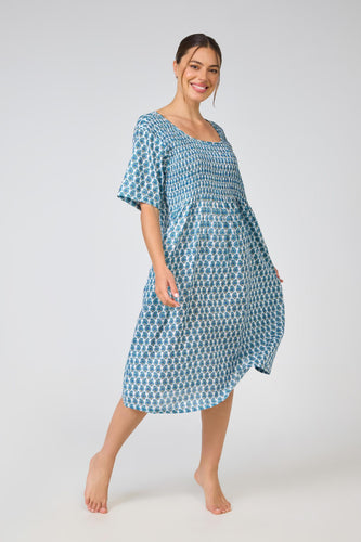 • Arabella Printed Blue Shirred Bodice Short Sleeve Nightie