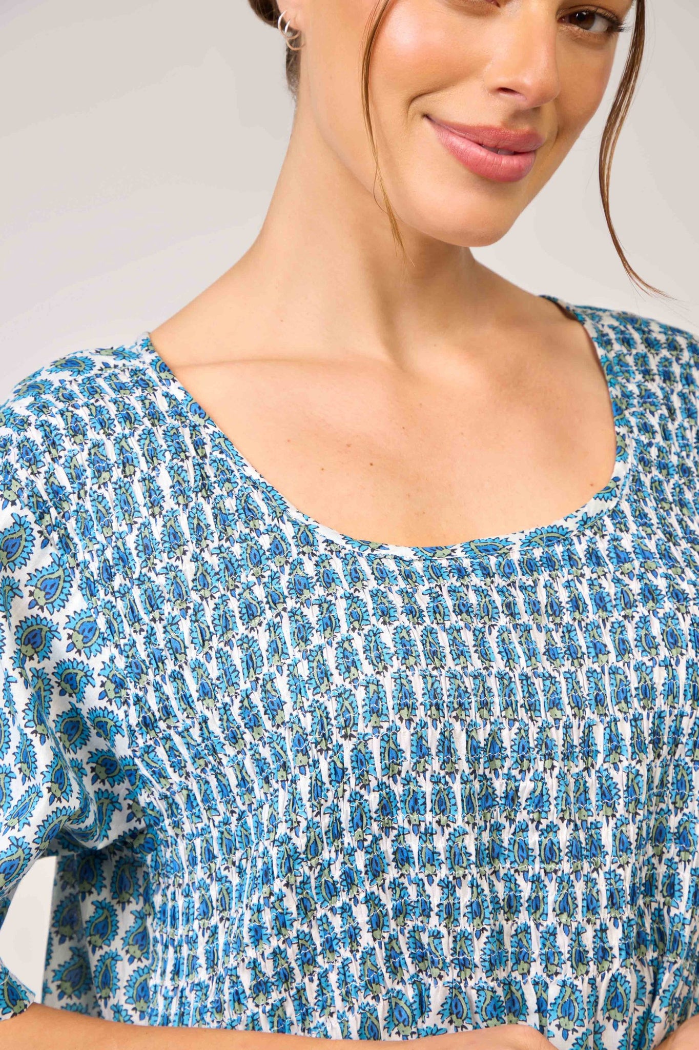 Arabella Printed Blue Shirred Bodice Short Sleeve Nightie