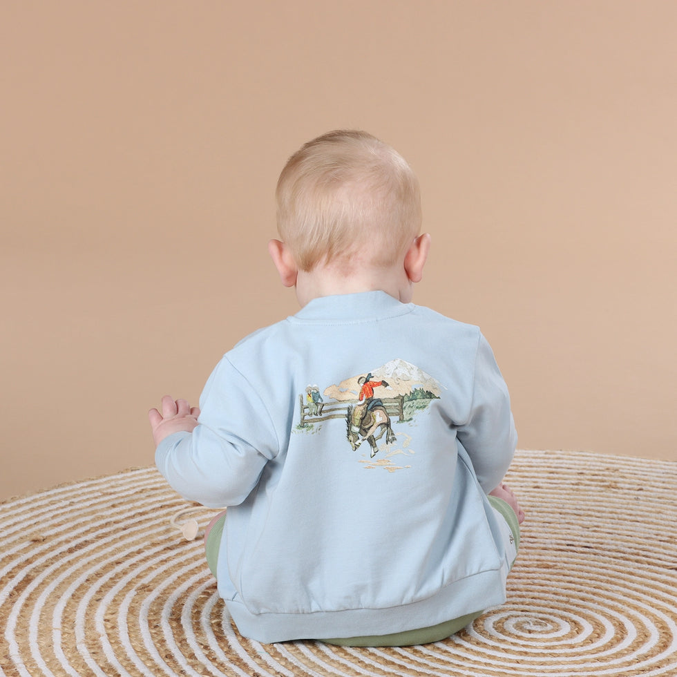 Little Bee by Dimples Wild West Collection is made using Oeko-Tex Certified Organic Cotton. With its versatile style, this stunning blue with a cowboy design on the back adds flair to any outfit, ensuring your baby looks adorable wherever they go.